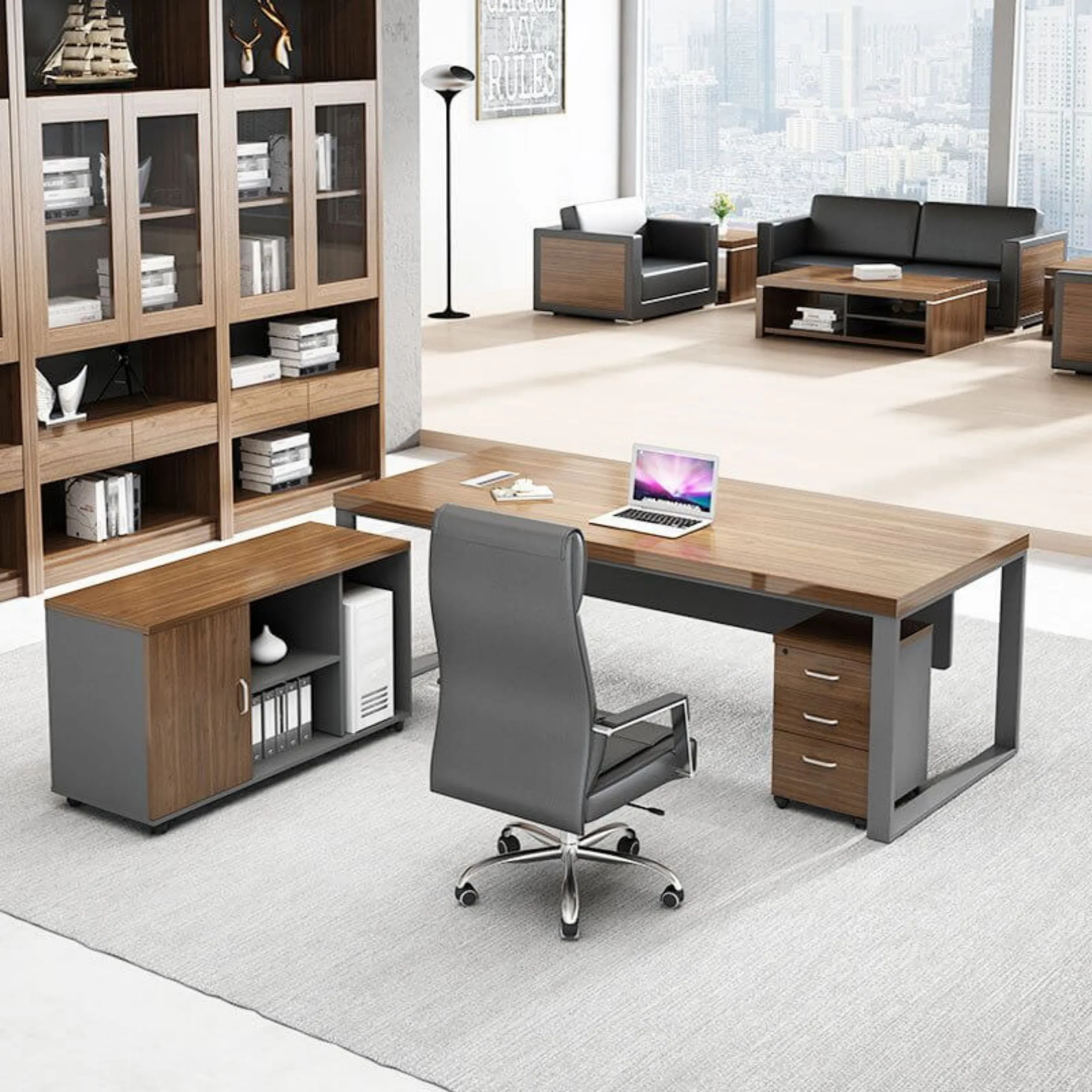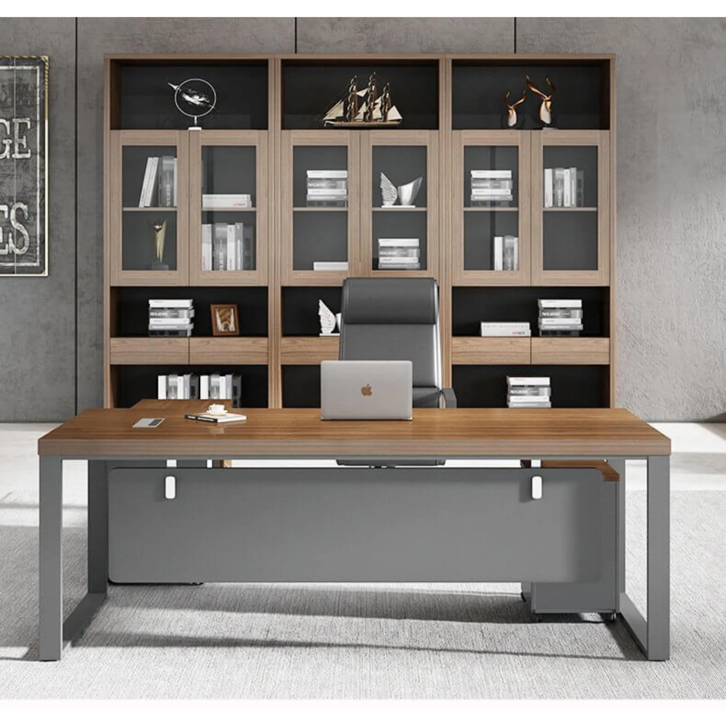 Bàn được thiết kế theo phong cách hiện đại lấy tông màu tối màu làm màu chủ đạo trong thiết kế. Bàn giám đốc được thiết kế đơn giản với một hộc tủ di động để chứa đồ. Bàn giám đốc được làm từ chất liễu gỗ công nghiệp có khả năng chống nước nhờ vào lớp phủ melamine, chống cong vênh mối mọt. Bàn đươc thiết kế hết sức đơn giản nhưng vẫn nôi bật nhờ thiết kế sự phối màu độc đáo.
