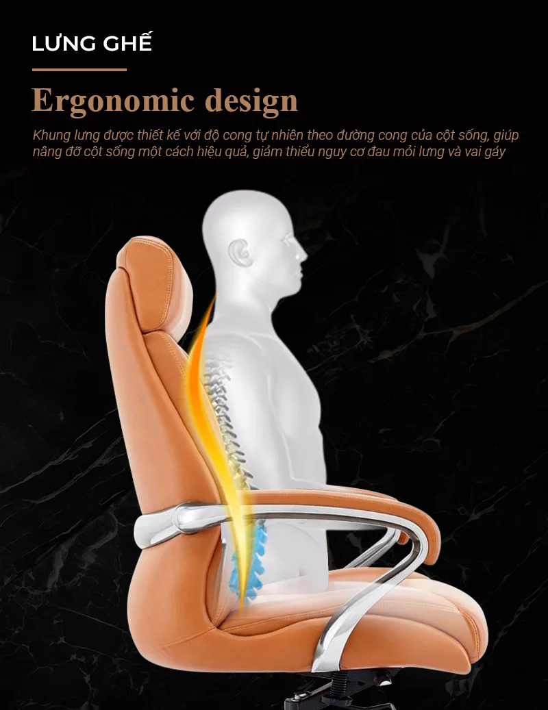 Phần lưng ghế được thiết kế công thái học, tựa lưng thiết kế ôm sát nâng đỡ lưng người ngồi, giải phóng áp lực lên cột sống giúp ngồi lâu không bị mỏi, làm việc thoải mái. Khung ghế chắc chắn được làm từ những chất liệu cao cấp với kích thước rộng rãi hơn đa phần các dòng sản phẩm ghế văn phòng trên thị trường, tạo cảm giác thoải mái cho người dùng khi ngồi làm việc trong suốt thời gian dài.