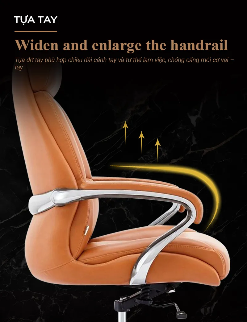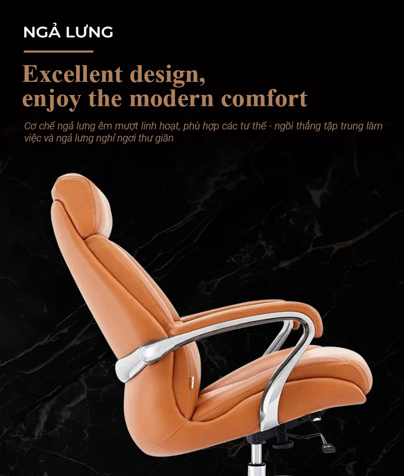 Ghế có Piston điều chỉnh giúp tăng giảm chiều cao mặt ghế phù hợp với chiều cao mặt bàn. Trục Piston SGS hỗ trợ xoay 360 độ. Mâm 2 cần ngả theo nhiều góc độ giúp người ngồi có thể làm việc, thư giãn thoải mái. Ghế có thiết kế hiện đại, sang trọng thường dùng cho các vị lãnh đạo trong công ty.