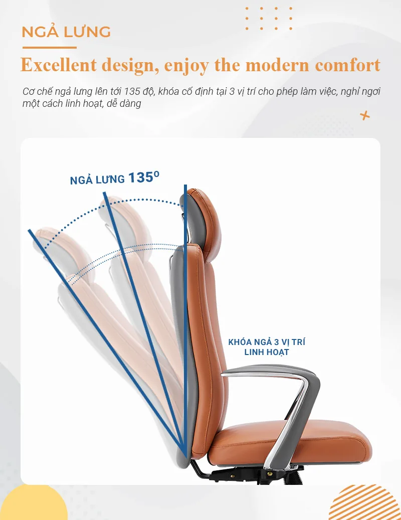 Mâm ghế dày 4.0mm có thể điều chỉnh ngả lưng lên tới 135 độ và khóa cố định tại 3 vị trí cho phép làm việc, nghỉ ngơi một cách linh hoạt.