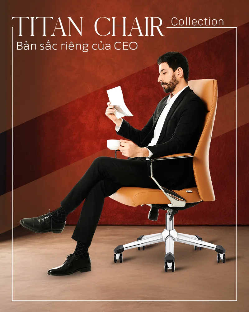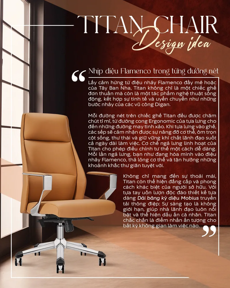 Chiếc ghế được đặt tên là “”Titan””, lấy cảm hứng từ sự bền bỉ, uyển chuyển, sáng tạo của những vũ công Flamenco. Ngoài ra trong thần thoại Hy Lạp, Titan còn được biết đến là những vị thần khổng lồ, đại diện cho sức mạnh. Chiếc ghế Titan mang trong mình tất cả sức mạnh của sự sáng tạo và khả năng truyền cảm hứng, nhanh chóng trở thành một biểu tượng của sự tinh tế, sang trọng và đẳng cấp được nhiều người yêu thích tạo nên BẢN SẮC RIÊNG CỦA CEO thế hệ mới.