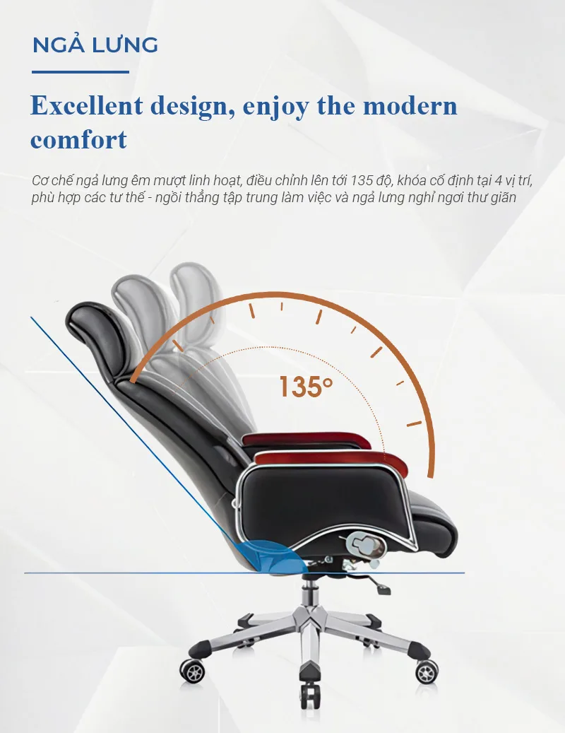 | Mâm ghế | Mâm ghế đa chức năng, độ dày 4.0mm, chịu lực cao, điều chỉnh ngả lưng lên tới 135 độ, khóa cố định 4 vị trí. Người dùng có thể tùy chỉnh độ ngả phù hợp với mục đích sử dụng khi làm việc hoặc nghỉ ngơi. |
